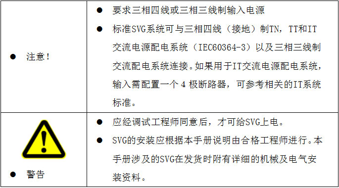【注】:SVG装置的电气部分的安装必须由经过培训的合格工程师依据“电工法则”进行,严禁其他人员违规进行安装,本手册只介绍安装的基本内容,具体安装细节请参考电工规范。