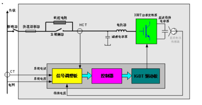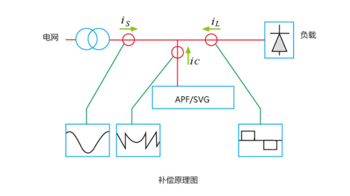 SVG通过外部电流互感器实时采集电流信号,通过内部检测电路分离出其中的谐波部分,通过IGBT功率变换器产生与系统中的谐波大小相等相位相反的补偿电流,实现滤除谐波的功能。