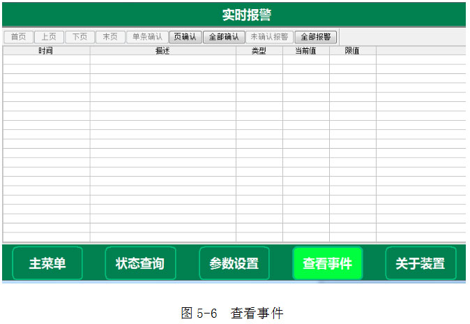 若装置存在异常,则屏幕右上角会显示感叹号“!”以示警告。此时可通过“查看事件”菜单进行查询具体异常信息。该页面显示设备记录的各种内部外部故障与报警信息。