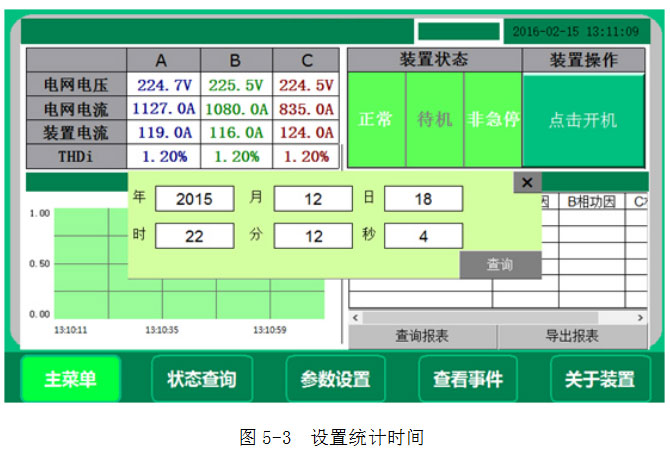 系统时间:点击上角系统时间的白色框区域,可以设置主菜单右上角的系统时间。报表统计以及事件记录都是依据系统时间工作的。如下图所示,点击后,则弹出对话框,供用户输入。