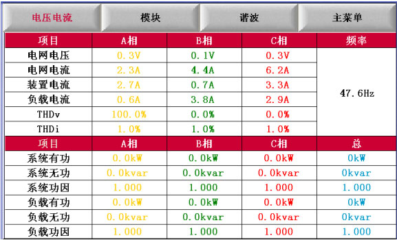 1、电压电流:显示电网电压、电网电流、系统功率因数、装置电流等