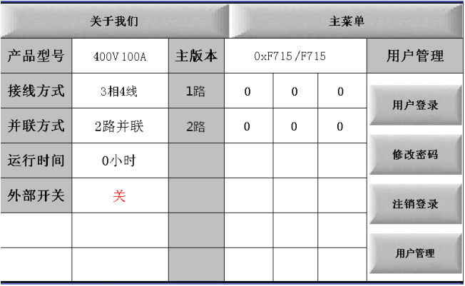 用户登录:可输入密码。密码分为:高级密码和用户两种等级。其中“高级密码”为工程调试人员使用,不对用户开放。用户密码为:2015;