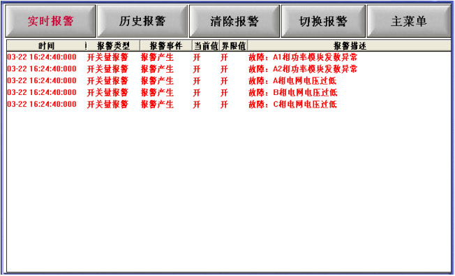实时报警:显示APF装置当前状态下的故障或者警告。