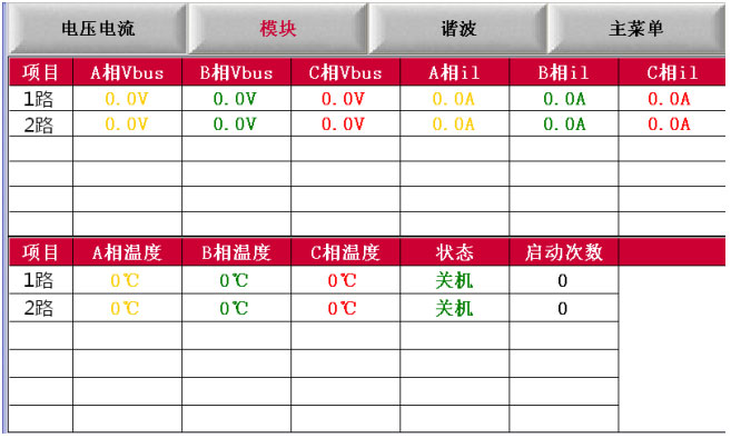 2、模块:显示功率单元模块A、B、C母线电压及补偿电流,显示功率单元模块A、B、C的散热片温度