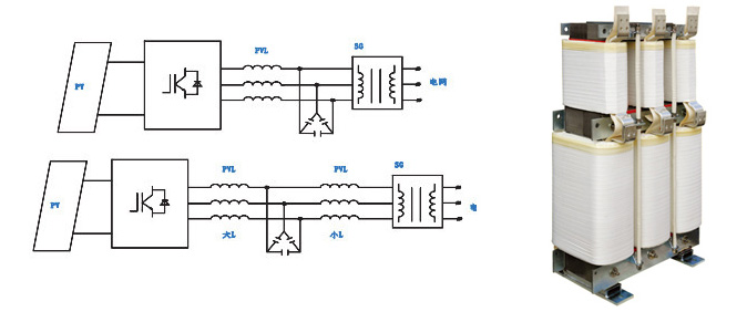 光伏逆变器与电网之间,滤波电抗器主要用于LC及LCL抑制光伏逆变器开关频率纹波电流所衍生的高次谐波电流,保护逆变器,净化电网.